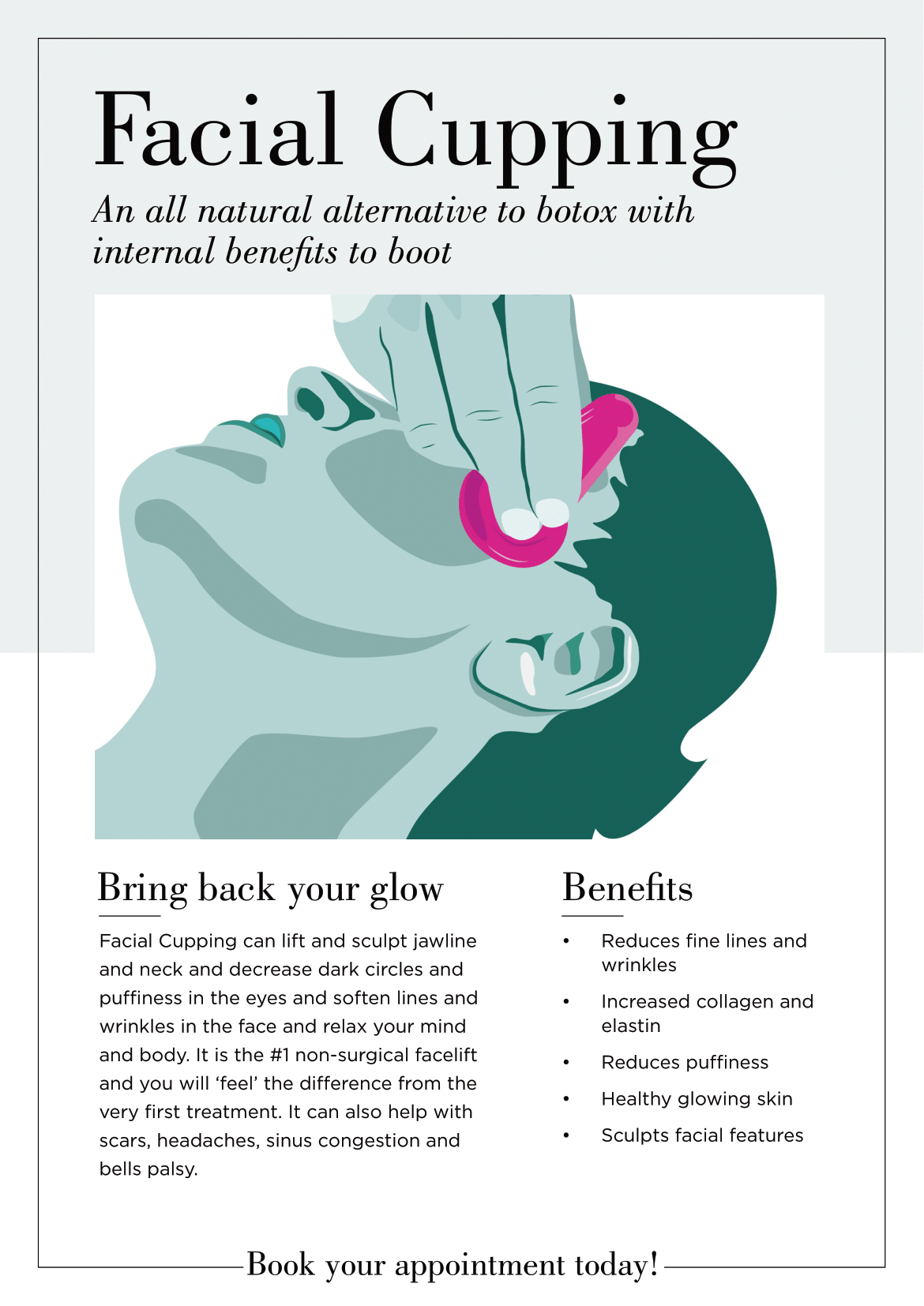 Please note that Facial Cupping is not suitable for children or anyone who has had botox or filler within the last 6 months. Please contact me if you are unsure if Facial Cupping is right for you.